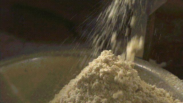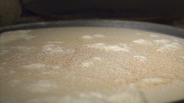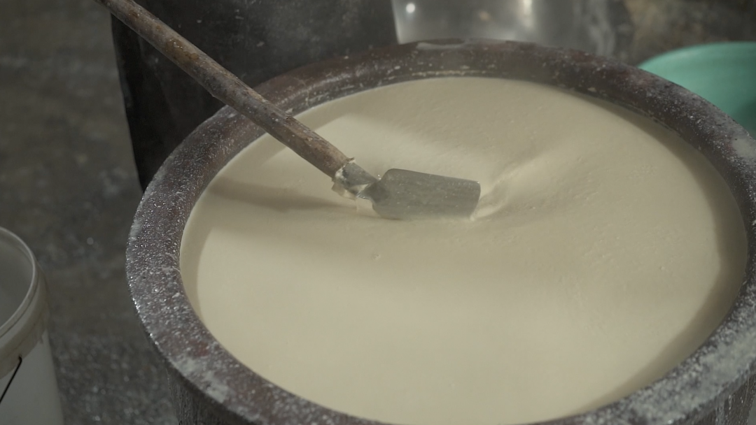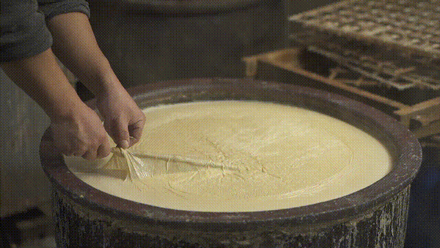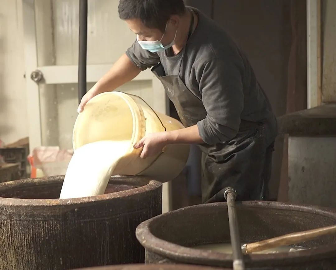 這三點又有多少豆腐制作者能做到??凑崎T人點漿很是有趣。煮沸了的豆汁倒進一大陶缸里,待溫度降到八十度左右,掌門人一臉神圣,將磨成粉沫攪成糊狀的石膏,緩緩注入缸中,邊注邊唱:
