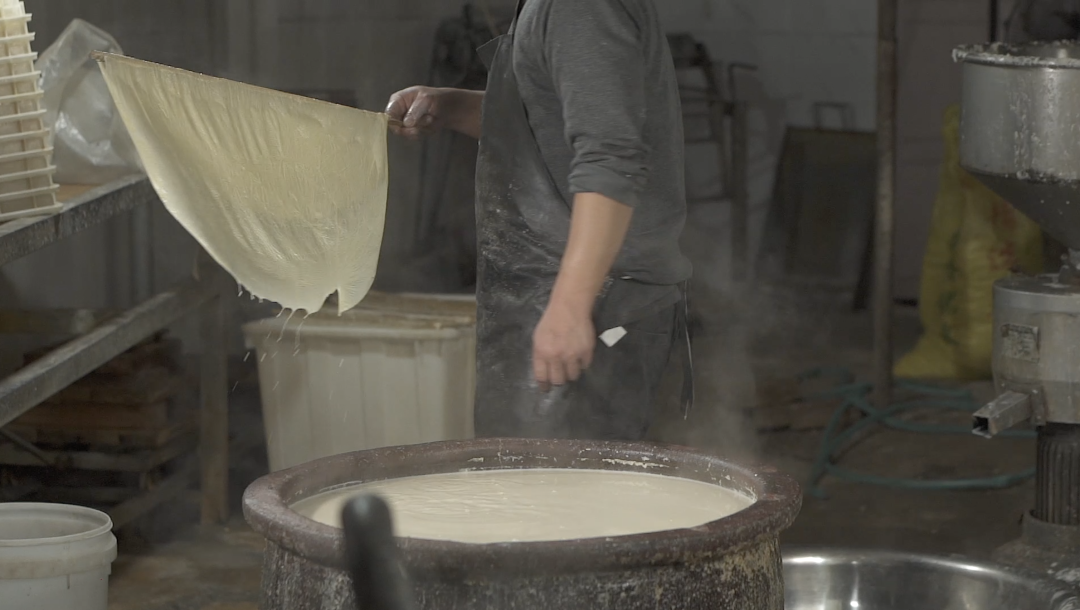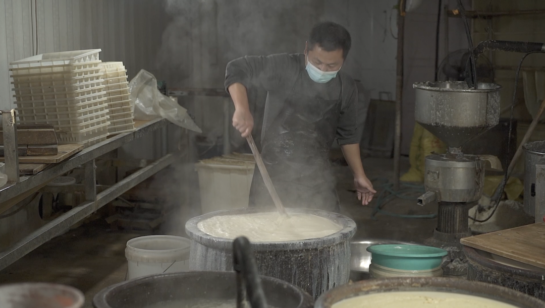 豆是紫蓬山間豆,水是紫蓬山間水,鍋是大鐵鍋,灶是山泥壘的土灶,灶洞中熊熊的火來自紫蓬山麻櫟的枝丫……鐵鍋煮漿汁,氤氳的是千年紫蓬山、百年吳山口的古意。