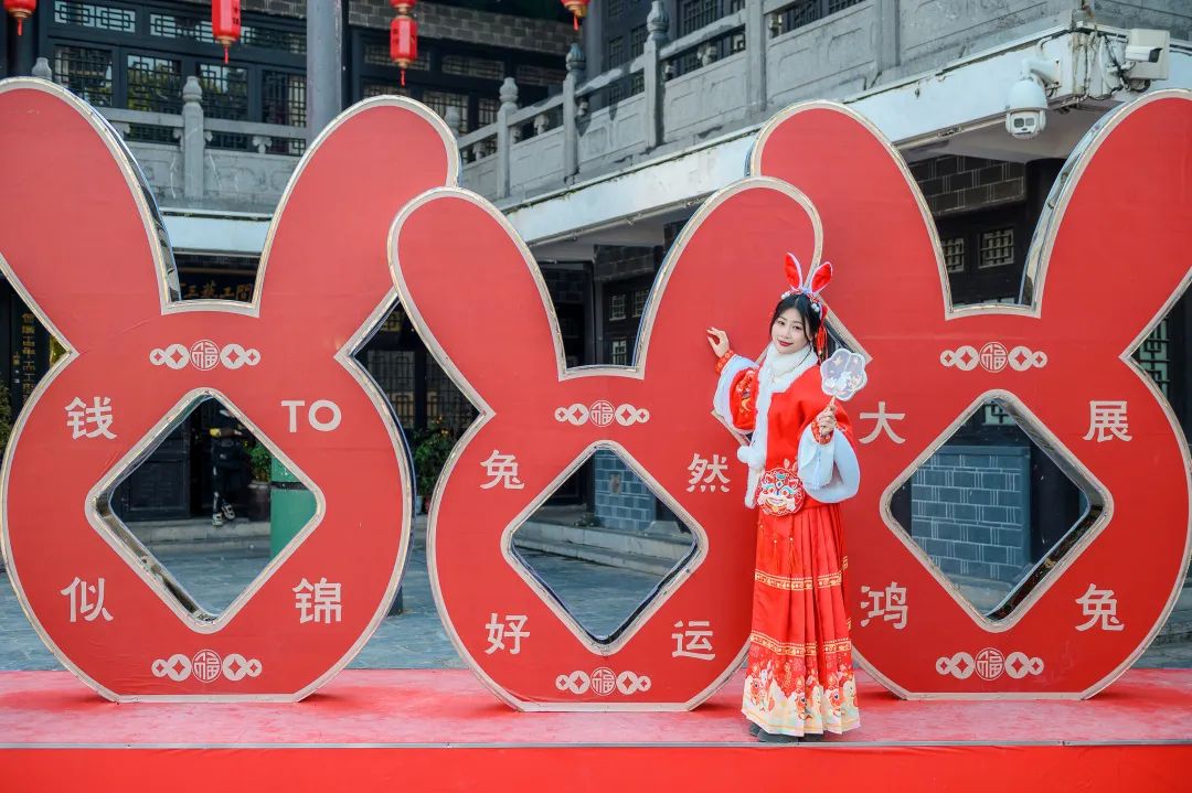 新春佳節(jié),古鎮(zhèn)徽韻建筑造型牽手兔年喜慶美陳,讓你感受春節(jié)濃厚氛圍。