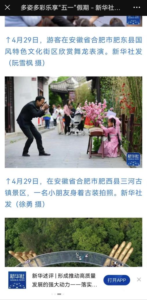 假日期間,新華社總社、央廣網(wǎng)、人民網(wǎng)、安徽日報(bào)、908安徽交通廣播新媒體、合肥新聞聯(lián)播等主流官方媒體紛紛進(jìn)行報(bào)道,對景區(qū)“五一”期間的假日氛圍、活動(dòng)布置均給予了高度的評價(jià)與贊揚(yáng),總曝光量超650萬。