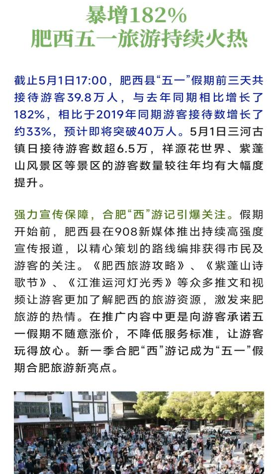 今年“五一”期間,三河古鎮(zhèn)景區(qū)開展了多種多樣的活動(dòng),既接地氣,又體驗(yàn)感十足,進(jìn)一步豐富了假日旅游市場。“看國潮表演、賞非遺、體驗(yàn)互動(dòng)演藝、逛八扇老街”成為三河古鎮(zhèn)假期活動(dòng)的一大亮點(diǎn)。景區(qū)圍繞“游夢千載,只此三河”為主題,引入安徽文化特色的黃梅戲、三河民俗表演、鼓上舞、雜技等表演形式,據(jù)統(tǒng)計(jì),此次活動(dòng)為期5天,共計(jì)完成節(jié)目表演106場,給游客帶來耳目一新的感覺。