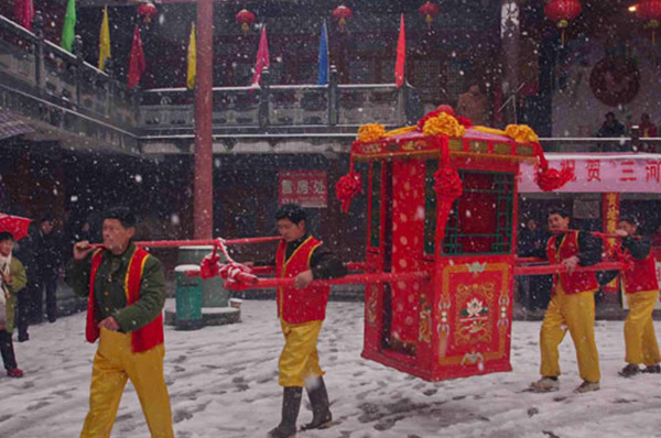 古鎮(zhèn)至今還保留著嫁娶新娘做花轎的傳統(tǒng)。在新婚當(dāng)日,新娘由娘家哥哥背出大門,坐上由婆家準(zhǔn)備的花轎,由伴娘陪著到婆家,新郎是不去接轎的,只在新房等。一路上,除鼓樂手吹吹打打以外,轎夫也有特定的任務(wù),每過一座橋時(shí)都要顛顛轎子,大約是三河水多橋多,隨喜的意思,所以轎夫抬著花轎要多過幾座橋,而且至少要過三座,象征著夫妻雙方恩恩愛愛、長(zhǎng)相廝守、生生世世在一起的意思。到了新房門口,迎親的鞭炮炸響起來,預(yù)示著一對(duì)新人紅紅火火,越過越好,到此,新郎終于可以從伴娘手中接過新娘的手,拉著新娘步入洞房,新房里面有喜娘和前來道喜的男方家的親戚,把祝福送給一對(duì)新人。
