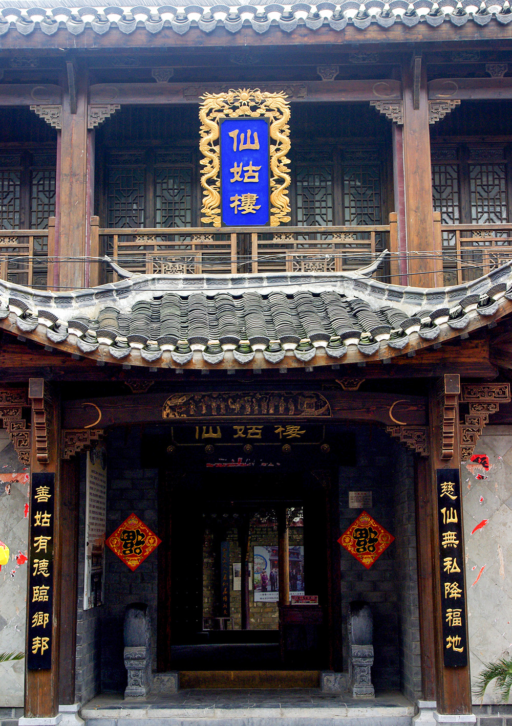 公元一八九八年,由施道生、彭鐘喬、王良志三人合伙投資食品工業(yè)“中和祥”正式創(chuàng)立。施道生為人敦厚,樂(lè)施好善,且篤志誠(chéng)信,佛界中的“好人善報(bào)”因果,常年香火伺奉,全家頂禮膜拜。三河百貨業(yè)巨賈“金聚豐”的當(dāng)家人與施道生情投意合,受其影響,集眾家商號(hào),全新建造“仙姑樓”、塑金身、設(shè)香案、燃明燭、敬貢糕、早晚上香、晨昏叩首。金竹齋先生雖家財(cái)萬(wàn)貫,但因無(wú)女,心中梗結(jié),時(shí)年中秋之夜,率妻室家人等,凈手素服,焚香跪拜,求賜一女,次年(1903年),其妻果生一女,取名“七姑”。從此,仙姑樓蜚聲鶴起,舒、桐、廬三縣及六安、合肥、蕪湖等地的善男信女,絡(luò)繹不絕?,F(xiàn)今的《仙姑樓》基本上保存了原有的全貌,民國(guó)二十五年刻立的《婆心濟(jì)世》石碑猶存。