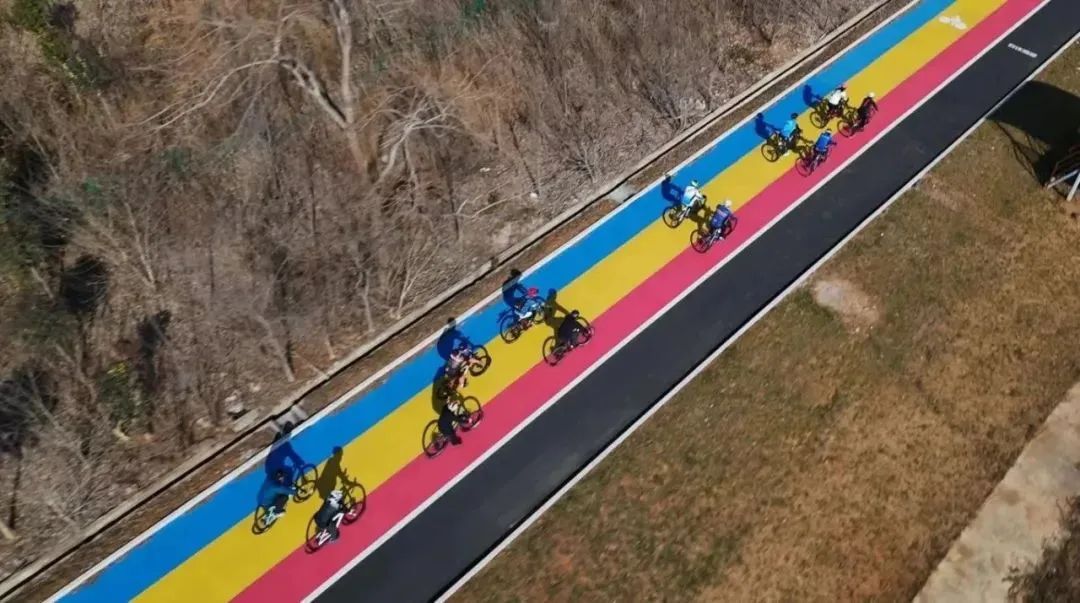 據(jù)三河文旅項(xiàng)目人士介紹,新建的騎行道位于紫蓬山內(nèi)環(huán)山路沿線,約8.8公里的標(biāo)準(zhǔn)騎行道路主要以紅黃藍(lán)三色相間而成,