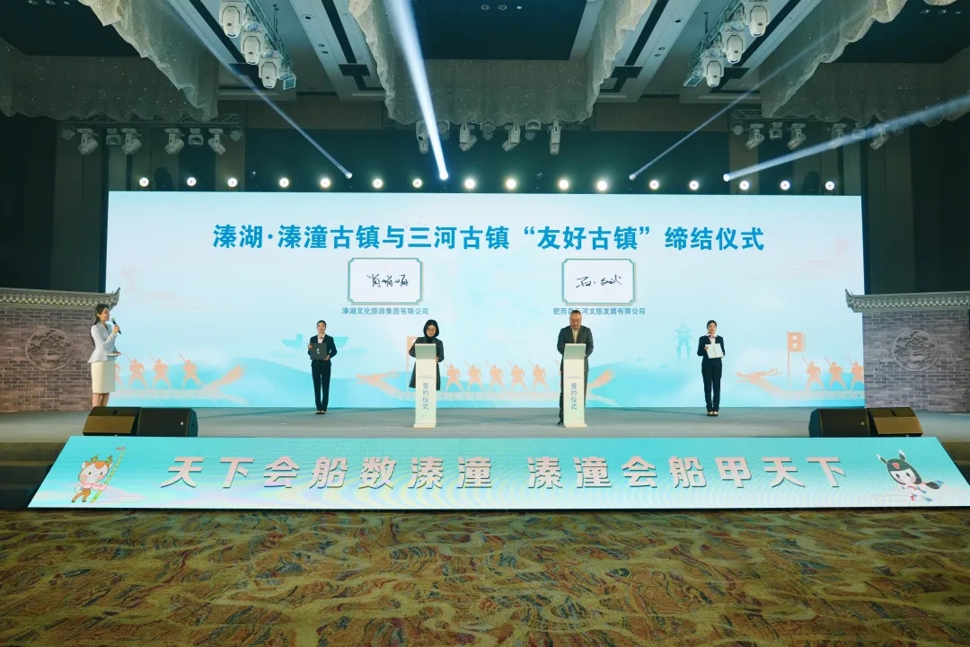 為了加強(qiáng)文化旅游交流,深化拓展雙邊協(xié)作,推介會(huì)現(xiàn)場(chǎng),合肥市肥西縣三河古鎮(zhèn)與泰州姜堰區(qū)溱潼古鎮(zhèn)締結(jié)為“友好古鎮(zhèn)”,