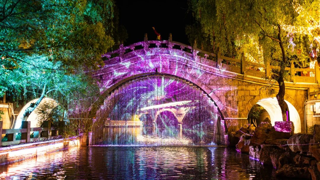“三河明月夜”主題夜游路線是本次直播的“重頭戲”。以小南河為軸線,晚七點(diǎn),瑰麗奇妙的新鮮旅程即刻開啟。乘坐夜游船從游客中心碼頭出發(fā),經(jīng)過仙歸橋、對越橋、望月橋、三縣橋、鵲渚廊橋,至二龍橋碼頭為止。夜游船每經(jīng)橋下,都會(huì)觸發(fā)橋洞水簾投影,“越秀煙雨”“望月摘星”“水月聆風(fēng)”“鵲橋相會(huì)”“花好月圓”“江山千里”“夢回三河”等故事隨著游船的前進(jìn)一一上演,古鎮(zhèn)的前世今生就這樣穿過厚重歷史,繾綣低吟來到人們身邊。