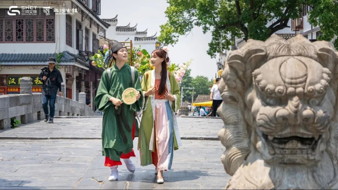 人群中還有宋代俊秀賣貨郎、俏生生的賣花娘,在徽式建筑“白墻黛瓦馬頭墻,回廊掛落花格窗”的映襯下,游客仿佛穿越回千年前。