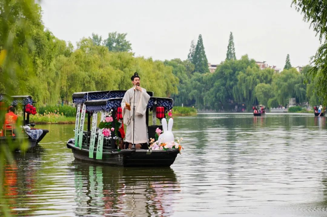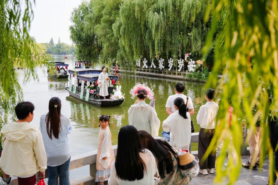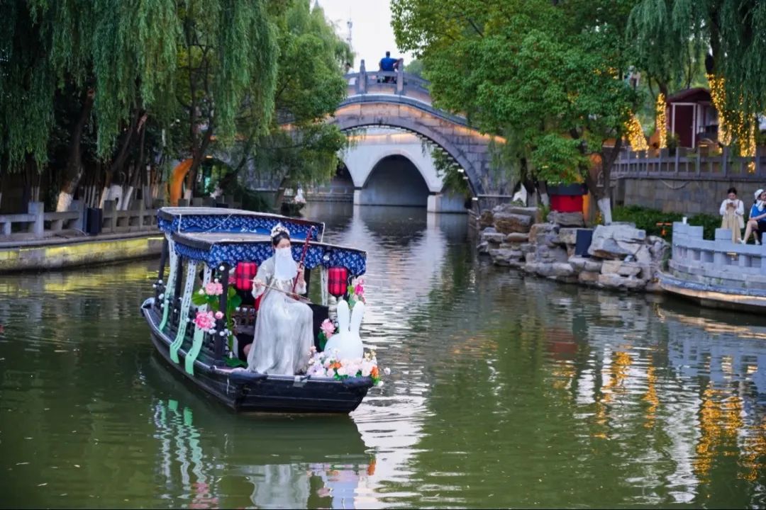 龍形游船徐徐航行,滿載著游客劃過兩岸,穿過橋洞、激起一陣陣碧浪。岸邊綠樹成蔭、花團(tuán)錦簇,楊柳樹彎腰垂下柔枝。