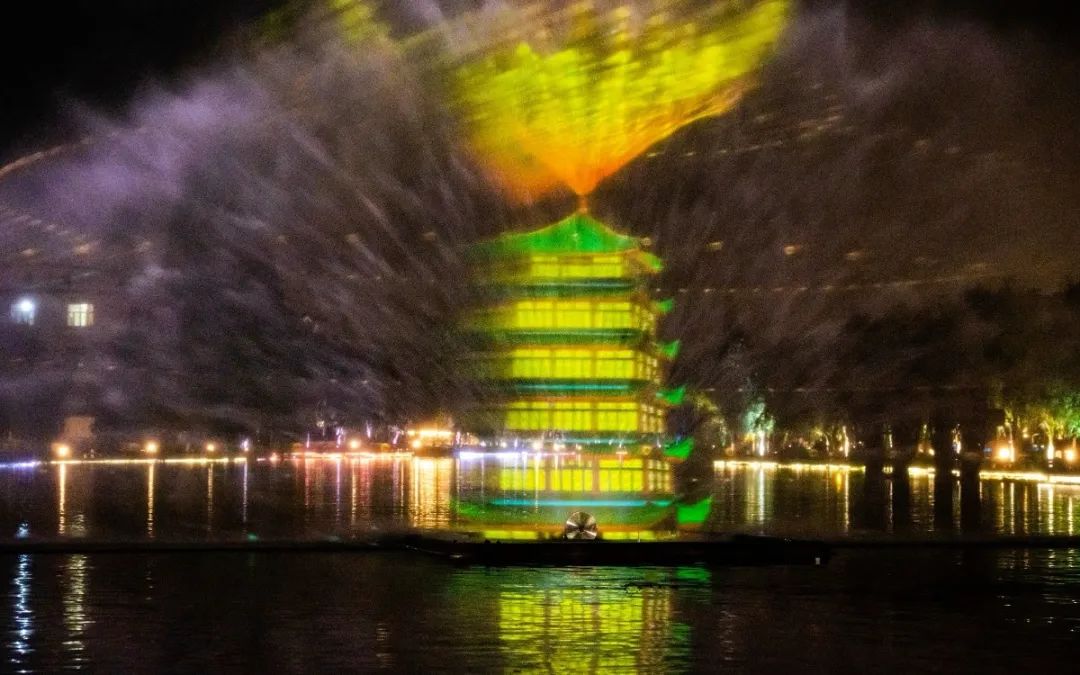 入夜,水上激光燈亮起,投射入水面,一時(shí)間河面燈光在水汽的氤氳下,如同海市蜃樓,分不清天上人間。